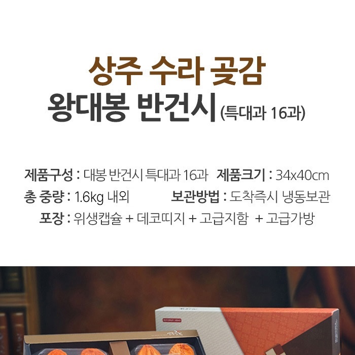 HOME > 추석선물세트 > 상주곶감 상주 수라곶감 선물세트 왕대봉 반건시 특대과 16과 1,6kg 내외부직포가방 아이스박스배송
