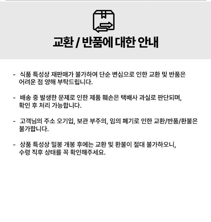 - 교환/반품 안내: 고객변심 및 주문착오에 의한 교환/반품은 제품 수령일로부터 7일 이내 가능합니다.