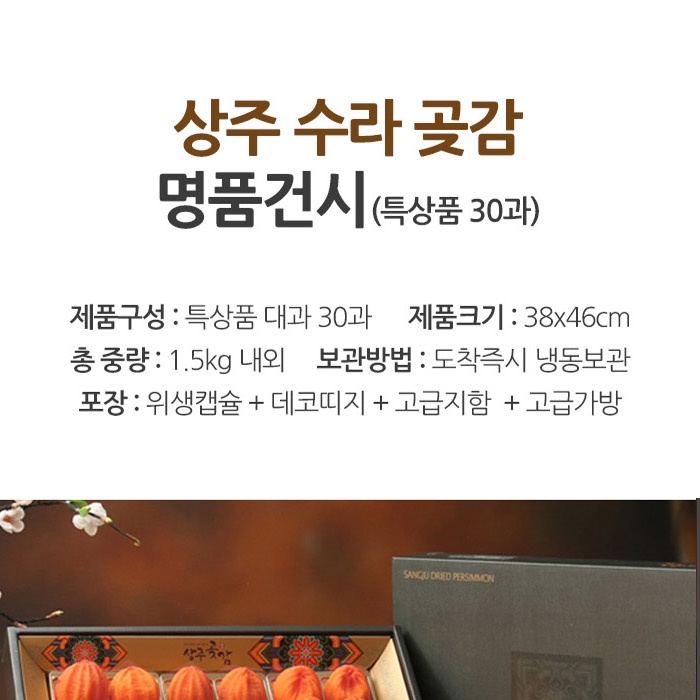 HOME > 추석선물세트 > 상주곶감 상주 수라곶감 선물세트 명품건시 특건시 대과 30과 1,5kg내외부직포가방 아이스박스배송